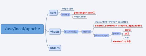 ディレクトリ構造 ①passenger.conf ・ ・ PassengerEnabled off <VirtualHost ${ipアドレス}:80> DocumentRoot ${vhostのドキュメントルート} ServerName ${vhost名} <Directory "${vhostのドキュメントルート}/${vhost名}/"> PassengerAppRoot ${sinatraのアプリのルート} RackEnv production RackBaseURI /${sinatraアプリのpublicディレクトリの</directory></virtualhost>…